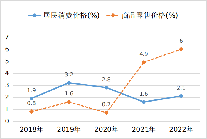 圖2 2018-2022年全市居民消費(fèi)價(jià)格及商品零售價(jià)格漲幅