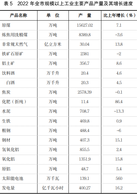 ????從產(chǎn)品產(chǎn)量看,全年全市規(guī)模以上工業(yè)企業(yè)原煤產(chǎn)量15627.02萬(wàn)噸,增長(zhǎng)7.1%;焦炭產(chǎn)量2578.39萬(wàn)噸,下降0.1%;白酒產(chǎn)量20.3萬(wàn)千升,增長(zhǎng)4.5%;鋼材產(chǎn)量407.3萬(wàn)噸,增長(zhǎng)15.1%;氧化鋁產(chǎn)量1351.9萬(wàn)噸,增長(zhǎng)15.8%;發(fā)電量400.27億千瓦小時(shí),增長(zhǎng)16.2%?!?span style="display:none">2022年山西省呂梁市國(guó)民經(jīng)濟(jì)和社會(huì)發(fā)展統(tǒng)計(jì)公報(bào)
