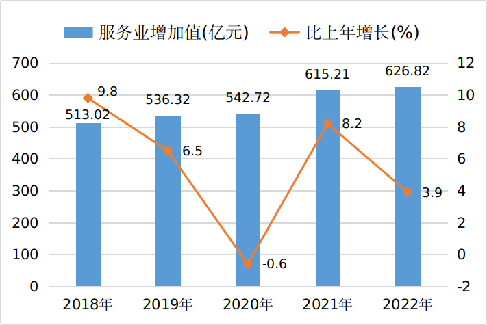 圖5 2018-2022年全市服務(wù)業(yè)增加值及增速