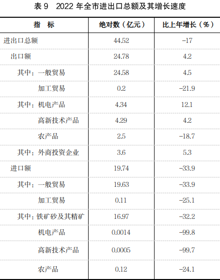 全年全市進(jìn)出口總額44.52億元,比上年下降17%。其中,進(jìn)口額19.74億元,下降33.9%;出口額24.78億元,增長(zhǎng)4.2%。