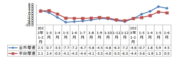 圖?2:2023年1-6月豐臺(tái)區(qū)社會(huì)消費(fèi)品零售額增速與城六區(qū)對(duì)比大牛工程師