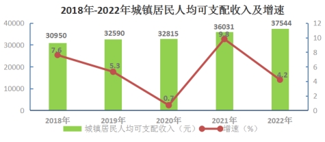 城鎮(zhèn)居民人均可支配收入37544元,增長4.2%。
