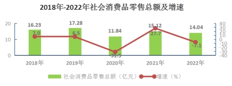 國內貿易:全縣限額以上批零住餐業(yè)44家(批發(fā)業(yè)營業(yè)收入2000萬元及以上,零售業(yè)營業(yè)收入500萬元及以上,住宿業(yè)和餐飲業(yè)營業(yè)收入200萬元及以上),其中限額以上法人單位40家,限額以上產業(yè)(大個體)單位4家。實現(xiàn)社會消費品零售總額14.04億元,下降7.1%。按經營地劃分,城鎮(zhèn)消費品零售額12.24億元,下降6.9%;農村消費品零售額1.8億元,下降8.6%。按消費形態(tài)分,餐飲收入1.63億元,下降16.4%;商品零售額12.41億元,下降5.8%。