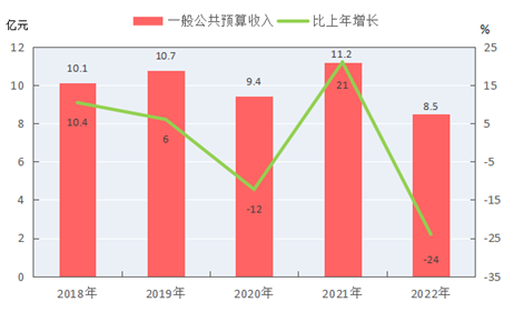 全年一般公共預(yù)算收入[10]8.5億元,比上年下降24%。一般公共預(yù)算地方收入7.5億元,增長11.3%。其中,稅收收入5.5億元,增長15.3%;非稅收入2.1億元,增長2%。一般公共預(yù)算支出49.8億元,增長3.4%。其中,一般公共服務(wù)支出5.6億元,增長25.5%;教育支出8.4億元,增長0.4%;社會保障和就業(yè)支出8.9億元,下降12.9%;衛(wèi)生健康支出6.6億元,增長10.6%;城鄉(xiāng)社區(qū)支出2.3億元,增長98.6%;農(nóng)林水支出9.6億元,增長2.8%。