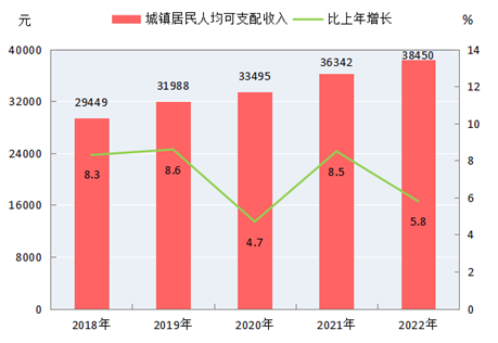 圖11 2018-2022年城鎮(zhèn)居民人均可支配收入及其增長速度