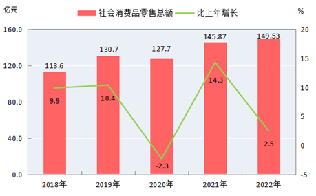 全年社會消費品零售總額149.53億元,比上年增長2.5%。按經(jīng)營地統(tǒng)計,城鎮(zhèn)消費品零售額130.81億元,增長2.6%;鄉(xiāng)村消費品零售額18.72億元,增長2.2%。按消費類型統(tǒng)計,商品零售額138.76億元,增長2.9%;餐飲收入額10.77億元,下降2.3%。