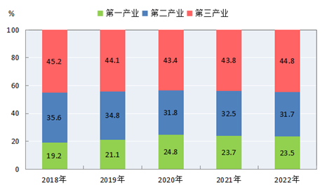 圖2 2018-2022年三次產(chǎn)業(yè)增加值占地區(qū)生產(chǎn)總值比重