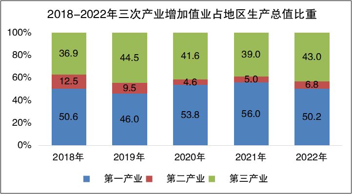 經(jīng)濟運行穩(wěn)中有進。初步核算,2022年全縣實現(xiàn)生產(chǎn)總值766713萬元,比上年增長3.7%。其中,第一產(chǎn)業(yè)增加值384926萬元,同比增長2.9%;第二產(chǎn)業(yè)增加值51995萬元,同比增長30.3%;第三產(chǎn)業(yè)增加值329792萬元,同比增長1.8%。三次產(chǎn)業(yè)結(jié)構(gòu)比由上年的55.9:5:39.1調(diào)整為50.2:6.8:43。