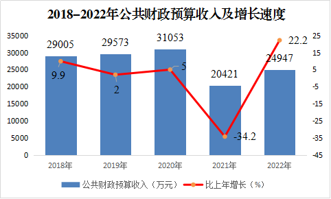 2022年全縣完成一般公共預(yù)算收入24947萬元,同比增長22.2%。在一般公共預(yù)算收入中,稅收收入13558萬元,同比下降5.8%?;鹗杖?4119萬元,同比下降43.7%。一般公共預(yù)算支出187716萬元,同比下降4.2%。