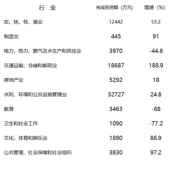 全年全縣固定資產(chǎn)投資(含房產(chǎn))8.89億元,增長23.4%。在庫項目(含房產(chǎn))70個,其中,新建35個,續(xù)建項目35個。在固定資產(chǎn)投資(含房產(chǎn))中,第一產(chǎn)業(yè)投資1.24億元,增長59.2%;第二產(chǎn)業(yè)投資0.9億元,增長21.3%;第三產(chǎn)業(yè)投資6.75億元,增長18.8%?;A設施投資5.54億元,增長39%,占固定資產(chǎn)投資的比重為62.3%。民生領域投資1.17億元,下降44.4%,占固定資產(chǎn)投資的比重為13.2%。