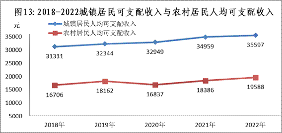 城鎮(zhèn)居民人均可支配收入35597元,名義增長1.8%;農(nóng)村居民人均可支配收入19588元,名義增長6.5%。