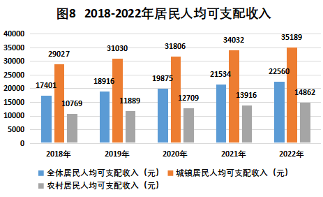 全體居民人均可支配收入22560元,比上年增長(zhǎng)4.8%。城鎮(zhèn)居民人均可支配收入35189元,比上年增長(zhǎng)3.4%。農(nóng)村居民人均可支配收入14862元,比上年增長(zhǎng)6.8%。