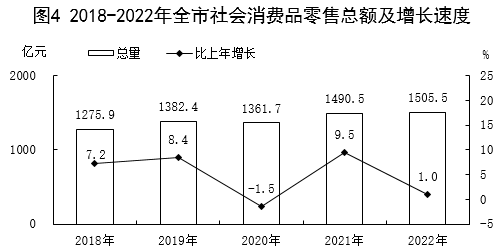全年社會(huì)消費(fèi)品零售總額1505.5億元,比上年增長1.0%。按經(jīng)營單位所在地統(tǒng)計(jì),城鎮(zhèn)消費(fèi)品零售額1308.2億元,增長1.1%;鄉(xiāng)村消費(fèi)品零售額197.3億元,增長0.6%。按消費(fèi)類型分,商品零售1435.9億元,增長1.1%;餐飲收入69.6億元,下降0.3%。