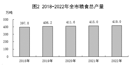 全年糧食播種面積1012.4萬畝,比上年增長0.4%。糧食總產(chǎn)量419.0萬噸,增長1.0%。其中,夏糧產(chǎn)量180.1萬噸,增長0.5%;秋糧產(chǎn)量238.9萬噸,增長1.3%。