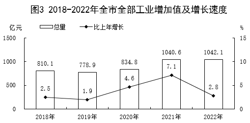 全部工業(yè)增加值1042.1億元,比上年增長2.8%。其中規(guī)模以上工業(yè)增加值增長0.8%。在規(guī)模以上工業(yè)中,分經(jīng)濟(jì)類型看,國有及國有控股企業(yè)增加值增長11.6%,股份制企業(yè)增長1.6%,外商及港澳臺(tái)商投資企業(yè)下降9.2%。分門類看,采礦業(yè)增加值下降10.7%,制造業(yè)下降0.1%,電力、熱力、燃?xì)饧八a(chǎn)和供應(yīng)業(yè)增長10.3%。