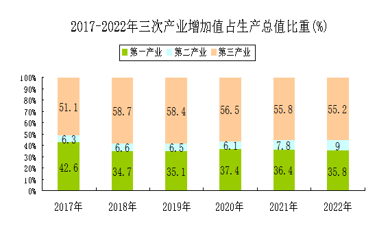 初步測算,全年地區(qū)生產(chǎn)總值實現(xiàn)135.4億元,按基期不變價格計算,比上年增長6.2%。其中,第一產(chǎn)業(yè)增加值48.5億元,同比增長2.7%;第二產(chǎn)業(yè)增加值12.1億元,同比增長16.3%;第三產(chǎn)業(yè)增加值74.8億元,同比增長7.3%;全年人均地區(qū)生產(chǎn)總值21481元。三次產(chǎn)業(yè)的結(jié)構(gòu)由上年的36.4:7.8:55.8調(diào)整為35.8:9.0:55.2。三次產(chǎn)業(yè)對GDP增長的貢獻率分別是16.6%、18.9%和64.5%;拉動GDP增長分別是1.02個、1.18個和4.01個百分點。