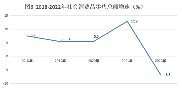 2022年全市社會消費品零售總額比上年下降6.8%。按經(jīng)營地統(tǒng)計,城鎮(zhèn)消費品零售額下降6.7%,鄉(xiāng)村消費品零售額下降7.0%。