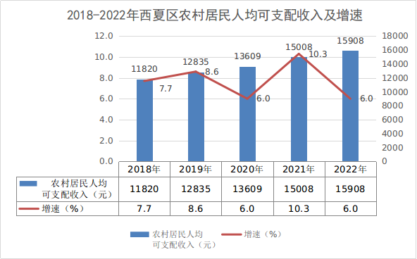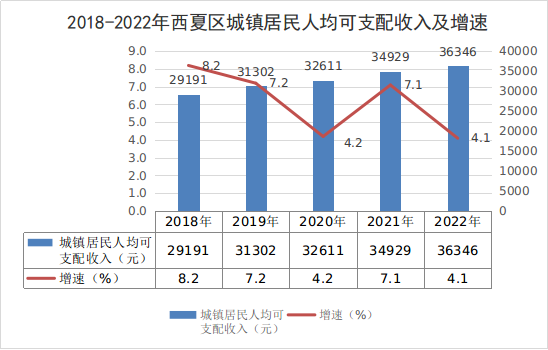 2022年,西夏區(qū)城鎮(zhèn)居民人均可支配收入36346元,比上年增加1417元,增長4.1%;農(nóng)村居民人均可支配收入15908元,比上年增加900元,增長6.0%。