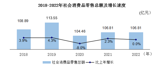 全年全市社會消費品零售總額106.81億元,與上年持平。按銷售單位所在地分,城鎮(zhèn)消費品零售額94.83億元,下降0.1%;農村消費品零售額11.97億元,增長0.9%。按消費形態(tài)分,商品零售91.31億元,下降0.1%,餐飲收入15.49億元,增長0.7%。