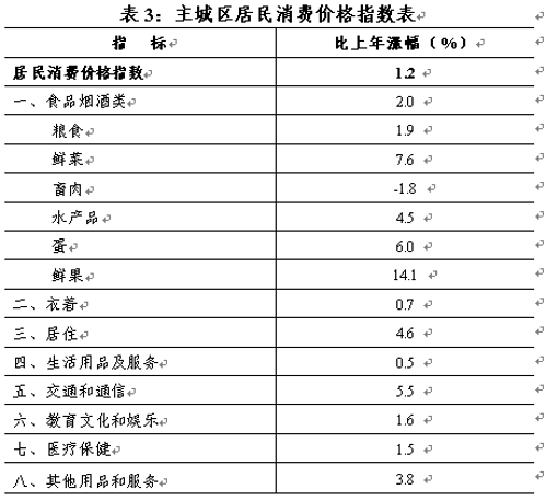 主城區(qū)居民消費(fèi)價(jià)格上漲1.2%。其中:食品煙酒類價(jià)格上漲2.0%,交通和通信類價(jià)格上漲5.5%,醫(yī)療保健類價(jià)格上漲1.5%,衣著類價(jià)格上漲0.7%,居住類價(jià)格下降4.6%,生活用品及服務(wù)類價(jià)格上漲0.5%,教育文化和娛樂類價(jià)格上漲1.6%,其他用品和服務(wù)類價(jià)格上漲3.8%。