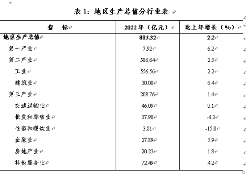 初步核算,全年地區(qū)生產(chǎn)總值完成803.32億元,按可比價(jià)格計(jì)算,比上年增長2.2%。其中,第一產(chǎn)業(yè)增加值7.92億元,增長6.2%;第二產(chǎn)業(yè)增加值586.64億元,增長2.5%;第三產(chǎn)業(yè)增加值208.76億元,增長1.4%。三次產(chǎn)業(yè)結(jié)構(gòu)為1.0:73.0:26.0。第一、二、三產(chǎn)業(yè)對地區(qū)生產(chǎn)總值增長的貢獻(xiàn)率分別為3.1%、75.3%和21.7%。人均地區(qū)生產(chǎn)總值達(dá)到143450元,比上年增長2.2%。