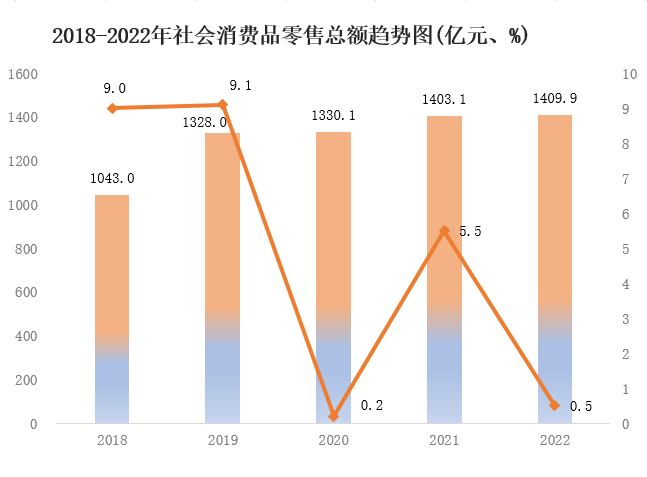 全年社會(huì)消費(fèi)品零售總額1409.9億元,同比增長(zhǎng)0.5%。分城鄉(xiāng)看,城鎮(zhèn)市場(chǎng)發(fā)展快于鄉(xiāng)村市場(chǎng),城鎮(zhèn)市場(chǎng)實(shí)現(xiàn)零售額1193.1億元,同比增長(zhǎng)1.4%;鄉(xiāng)村市場(chǎng)實(shí)現(xiàn)零售額216.8億元,同比下降4.3%,城鎮(zhèn)市場(chǎng)增速高于鄉(xiāng)村市場(chǎng)5.7個(gè)百分點(diǎn)。