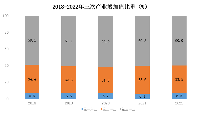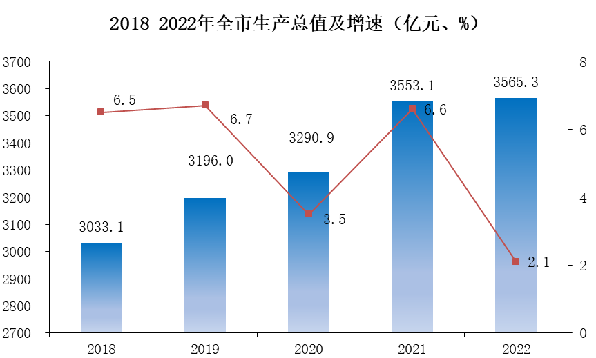 初步核算,2022年全市地區(qū)生產(chǎn)總值3565.3億元,同比增長(zhǎng)2.1%。第一產(chǎn)業(yè)增加值230.2億元,同比增長(zhǎng)1.6%;第二產(chǎn)業(yè)增加值1195.3億元,同比增長(zhǎng)3.2%;第三產(chǎn)業(yè)增加值2139.8億元,同比增長(zhǎng)1.5%。三次產(chǎn)業(yè)結(jié)構(gòu)為6.5:33.5:60.0。全市人均生產(chǎn)總值為64626元,同比增長(zhǎng)2.0%。