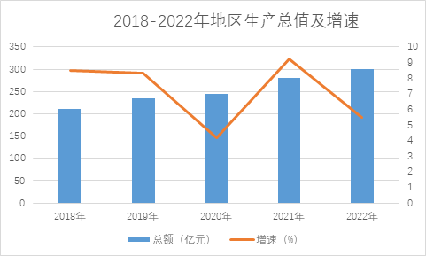 圖1、2018-2022年地區(qū)生產(chǎn)總值及增速
