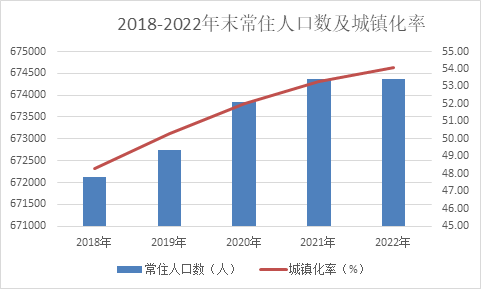 圖2、2018-2022年末常住人口數(shù)及城鎮(zhèn)化率