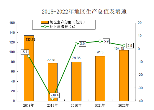 初步核算,全年實(shí)現(xiàn)地區(qū)生產(chǎn)總值104.18億元,比上年增長2.5%,其中:第一產(chǎn)業(yè)增加值10.55億元,增長4.8%;第二產(chǎn)業(yè)增加值64.96億元,增長0.7%;第三產(chǎn)業(yè)增加值28.67億元,增長5.1%。
