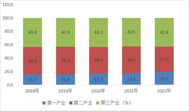 圖2 2018-2022年三次產(chǎn)業(yè)增加值占地區(qū)生產(chǎn)總值比重