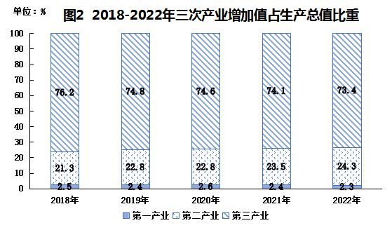 ? ?經(jīng)市統(tǒng)計局統(tǒng)一核算,全年全區(qū)地區(qū)生產(chǎn)總值416.3億元,比上年增長5.1%。其中,第一產(chǎn)業(yè)增加值9.7億元,增長2.8%;第二產(chǎn)業(yè)增加值101.0億元,增長8.2%;第三產(chǎn)業(yè)增加值305.6億元,增長4.2%。三次產(chǎn)業(yè)對經(jīng)濟(jì)增長的貢獻(xiàn)率分別為1.3%、37.4%和61.3%,分別拉動GDP增長0.07、1.91和3.12個百分點(diǎn)。經(jīng)濟(jì)結(jié)構(gòu)進(jìn)一步調(diào)整。三次產(chǎn)業(yè)結(jié)構(gòu)比由上年的2.4:23.5:74.1調(diào)整為2.3:24.3:73.4,第三產(chǎn)業(yè)占比較上年下降0.7個百分點(diǎn)。人均地區(qū)生產(chǎn)總值76804元,增長5.4%。