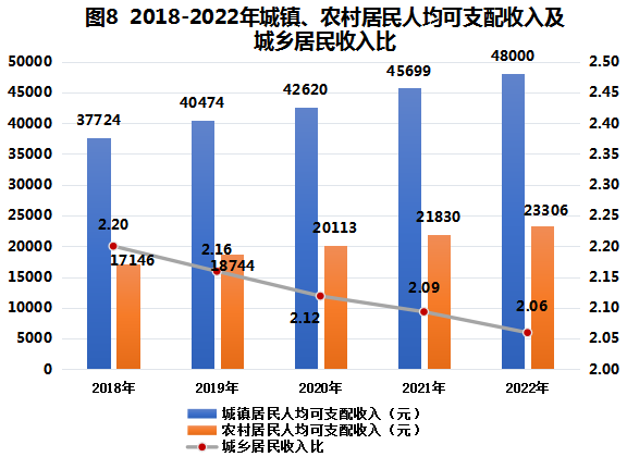 ? ?全年全區(qū)居民人均可支配收入40668元,比上年增長5.7%。其中,城鎮(zhèn)居民人均可支配收入48000元,增長5.0%;農(nóng)村居民人均可支配收入23306元,增長6.8%。城鄉(xiāng)居民收入比2.06:1,比上年縮小0.03。