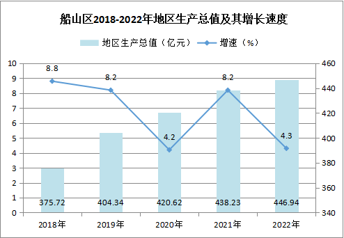 地區(qū)生產(chǎn)總值(GDP)。根據(jù)地區(qū)生產(chǎn)總值統(tǒng)一核算結(jié)果,2022年船山區(qū)實(shí)現(xiàn)地區(qū)生產(chǎn)總值(GDP)446.94億元,按可比價(jià)格計(jì)算,比上年增長(zhǎng)4.3%。其中,第一產(chǎn)業(yè)增加值24.19億元,增長(zhǎng)4.2%;第二產(chǎn)業(yè)增加值190.67億元,增長(zhǎng)5.2%;第三產(chǎn)業(yè)增加值232.08億元,增長(zhǎng)3.6%。三次產(chǎn)業(yè)結(jié)構(gòu)調(diào)整為5.4:42.7:51.9,第一產(chǎn)業(yè)對(duì)經(jīng)濟(jì)增長(zhǎng)的貢獻(xiàn)率為6.0%,拉動(dòng)經(jīng)濟(jì)增長(zhǎng)0.2個(gè)百分點(diǎn);第二產(chǎn)業(yè)對(duì)經(jīng)濟(jì)增長(zhǎng)的貢獻(xiàn)率為50.2%,拉動(dòng)經(jīng)濟(jì)增長(zhǎng)2.2個(gè)百分點(diǎn);第三產(chǎn)業(yè)對(duì)經(jīng)濟(jì)增長(zhǎng)的貢獻(xiàn)率為43.8%,拉動(dòng)經(jīng)濟(jì)增長(zhǎng)1.9個(gè)百分點(diǎn)。