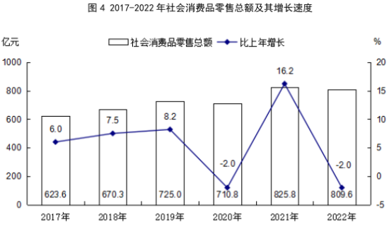 全年全市社會(huì)消費(fèi)品零售總額809.6億元,比上年下降 2.0%。按經(jīng)營(yíng)地統(tǒng)計(jì),城鎮(zhèn)消費(fèi)品零售額632.1億元,下降1.4%;鄉(xiāng)村消費(fèi)品零售額177.5億元,下降4.0%。按消費(fèi)類型統(tǒng)計(jì),商品零售額735.7億元,下降0.4%;餐飲收入73.9億元,下降15.0%。