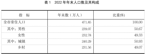 2022年年末全市常住人口為471.85萬人,比上年末減少1.47萬人。其中,城鎮(zhèn)常住人口240.29萬人,占常住人口比重為50.93%,比上年末提高0.67個(gè)百分點(diǎn)。全年出生人口3.20萬人,出生率為6.78‰;死亡人口4.00萬人,死亡率為8.46‰;自然增長(zhǎng)率為-1.68‰。