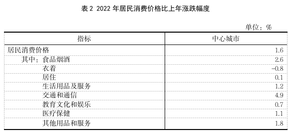 全年中心城市居民消費(fèi)價(jià)格比上年上漲1.6%。其中,食品煙酒價(jià)格上漲2.6%,交通和通信價(jià)格上漲4.9%。商品零售價(jià)格比上年上漲3.3%。
