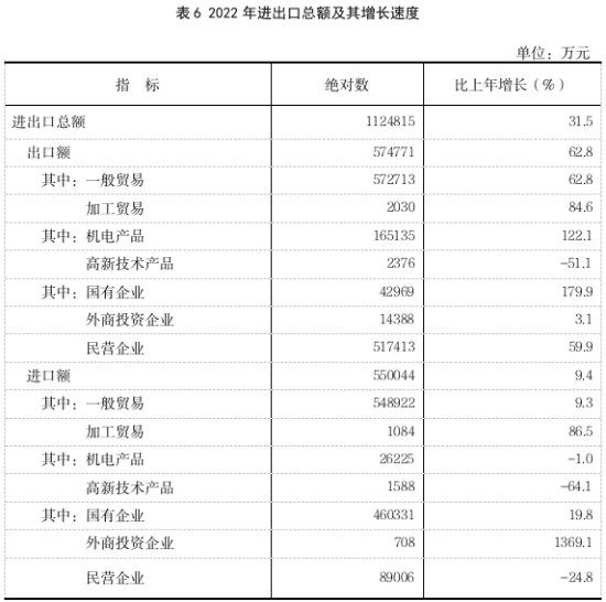 全年全市進(jìn)出口總額112.5億元,比上年增長(zhǎng)31.5%(以美元計(jì)價(jià)為17.0億美元,增長(zhǎng)28.7%)。其中,進(jìn)口55.0億元,增長(zhǎng)9.4%(以美元計(jì)價(jià)為8.4億美元,增長(zhǎng)7.6%);出口57.5億元,增長(zhǎng)62.8%(以美元計(jì)價(jià)為8.7億美元,增長(zhǎng)58.7%)。