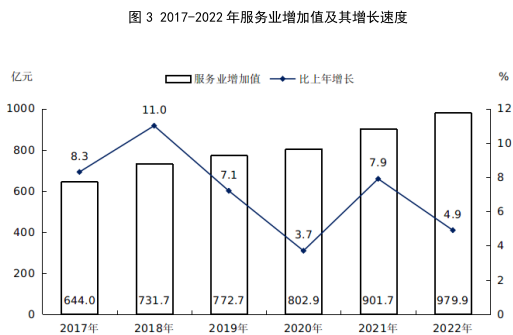 全年全市服務(wù)業(yè)增加值979.9億元,按不變價(jià)格計(jì)算,比上年增長(zhǎng)4.9%。其中,交通運(yùn)輸、倉儲(chǔ)和郵政業(yè)增加值112.6億元,下降1.7%;批發(fā)和零售業(yè)增加值180.5億元,增長(zhǎng)4.2%;住宿和餐飲業(yè)增加值15.8億元,增長(zhǎng)1.1%;金融業(yè)增加值105.7億元,增長(zhǎng)6.6%;房地產(chǎn)業(yè)增加值76.8億元,下降5.5%;其他服務(wù)業(yè)增加值464.1億元,增長(zhǎng)8.8%。全年規(guī)模以上服務(wù)業(yè)企業(yè)營(yíng)業(yè)收入比上年增長(zhǎng)14.9%,利潤(rùn)總額增長(zhǎng)43.1%。