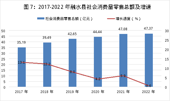 全縣實(shí)現(xiàn)社會(huì)消費(fèi)品零售總額47.37億元,比上年增長0.6%。按銷售單位所在地分,城鎮(zhèn)零售額29.76億元,增長1.1%,鄉(xiāng)村零售額17.61億元,下降0.1%;按消費(fèi)形態(tài)分,餐飲收入12.97億元,增長10.3%,商品零售34.4億元,下降2.6%。