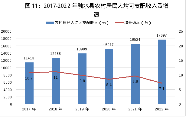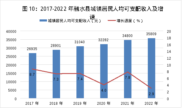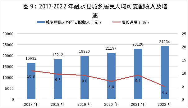 城鄉(xiāng)居民人均可支配收入24234元,比上年增加1114元,增長4.8%。其中,城鎮(zhèn)居民人均可支配收入35809元,比上年增加1009元,增長2.9%;農(nóng)村居民人均可支配收入17697元,比上年增加1173元,增長7.1%。