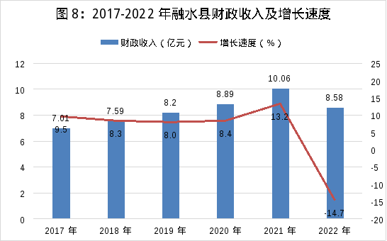 財(cái)政收入8.58億元,下降14.7%。其中:公共財(cái)政預(yù)算收入6.09億元,下降15.9%。全縣財(cái)政公共預(yù)算支出33.78億元,比上年下降14.2%。