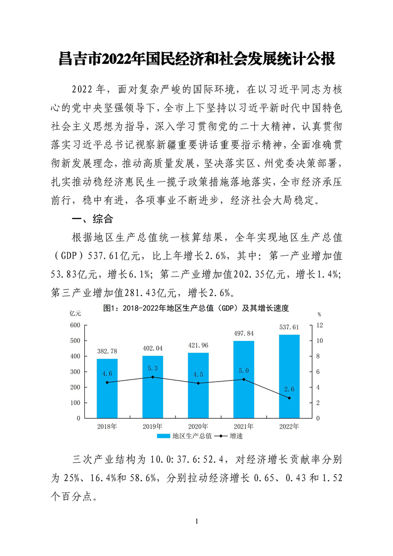 2022年昌吉回族自治州昌吉市人民政府國民經濟和社會發(fā)展統(tǒng)計公報(2023年更新)