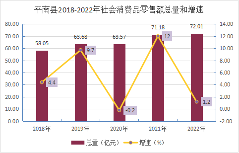 全年社會消費品零售總額72.01億元,比上年增長1.2%。按經(jīng)營單位所在地分,城鎮(zhèn)消費品零售額65.79億元,增長1.5%;鄉(xiāng)村消費品零售額6.22億元,下降2.1%。按消費類型分,餐飲收入19.66億元,下降0.5%;商品零售52.35億元,增長1.8%。
