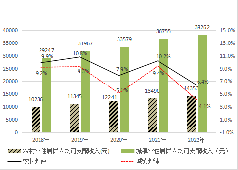 圖?8?2018年-2022年農(nóng)村、城鎮(zhèn)常住居民人均可支配收入情況