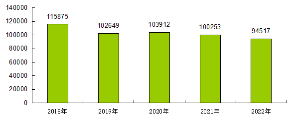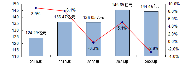 消費品市場發(fā)展緩慢。2022年全年社會消費品零售總額569221萬元,比上年下降3.4%。按消費類型統(tǒng)計,商品零售額下降3.4%,餐飲收入增長3.5%。
