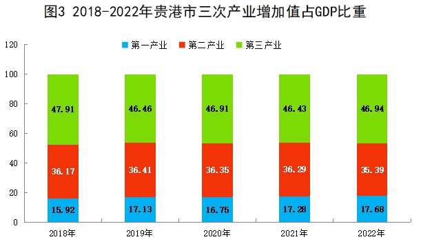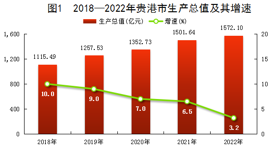初步核算,2022年貴港市生產(chǎn)總值(GDP)1572.10億元,按可比價計算,比上年增長3.2%,兩年平均增長4.8%。其中,第一產(chǎn)業(yè)增加值277.87億元,增長4.2%;第二產(chǎn)業(yè)增加值556.34億元,增長3.2%;第三產(chǎn)業(yè)增加值737.89億元,增長2.9%。一、二、三產(chǎn)業(yè)增加值占地區(qū)生產(chǎn)總值的比重分別為17.7%:35.4%:46.9%,對經(jīng)濟增長的貢獻率分別為23.2%、34.1%、42.7%。按常住人口計算,全年人均地區(qū)生產(chǎn)總值36116元,比上年增加1480元,增長2.8%。