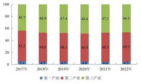 圖2:2017-2022年全市三次產(chǎn)業(yè)增加值占生產(chǎn)總值比重