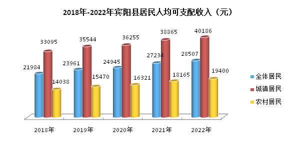 居民生活:2022年賓陽縣全體居民人均可支配收入28507元,比上年增收1273元,名義上增長4.7%;城鎮(zhèn)居民人均可支配收入40186元,比上年增收1321元,名義上增長3.4%;農村居民人均可支配收入19400元,比上年增收1235元,名義上增長6.8%。
