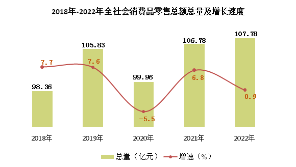 2022年全縣商品銷售額比上年增長5.3%,其中:批發(fā)業(yè)銷售額比上年增長23.7%;零售業(yè)銷售額比上年下降0.4%。
